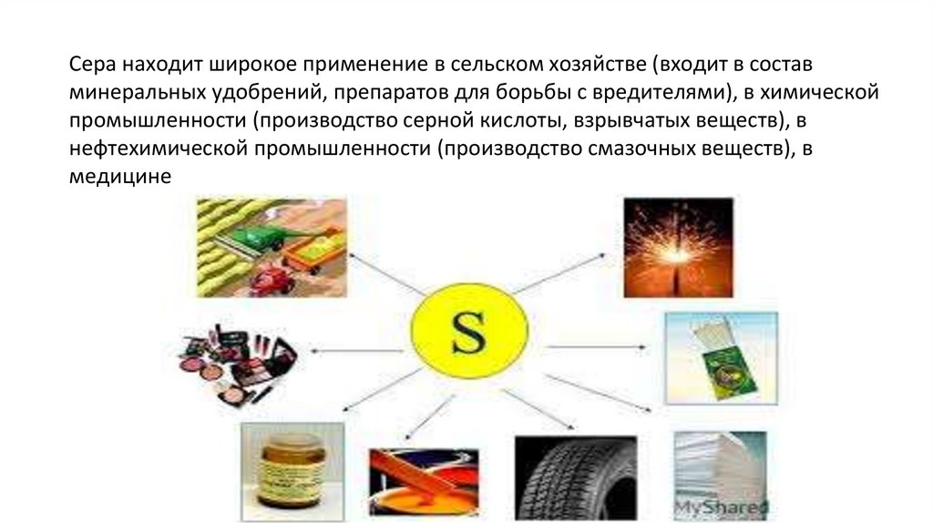 Сера находит широкое применение в сельском хозяйстве (входит в составминеральных удобрений, препаратов для борьбы с вредителями), в химической