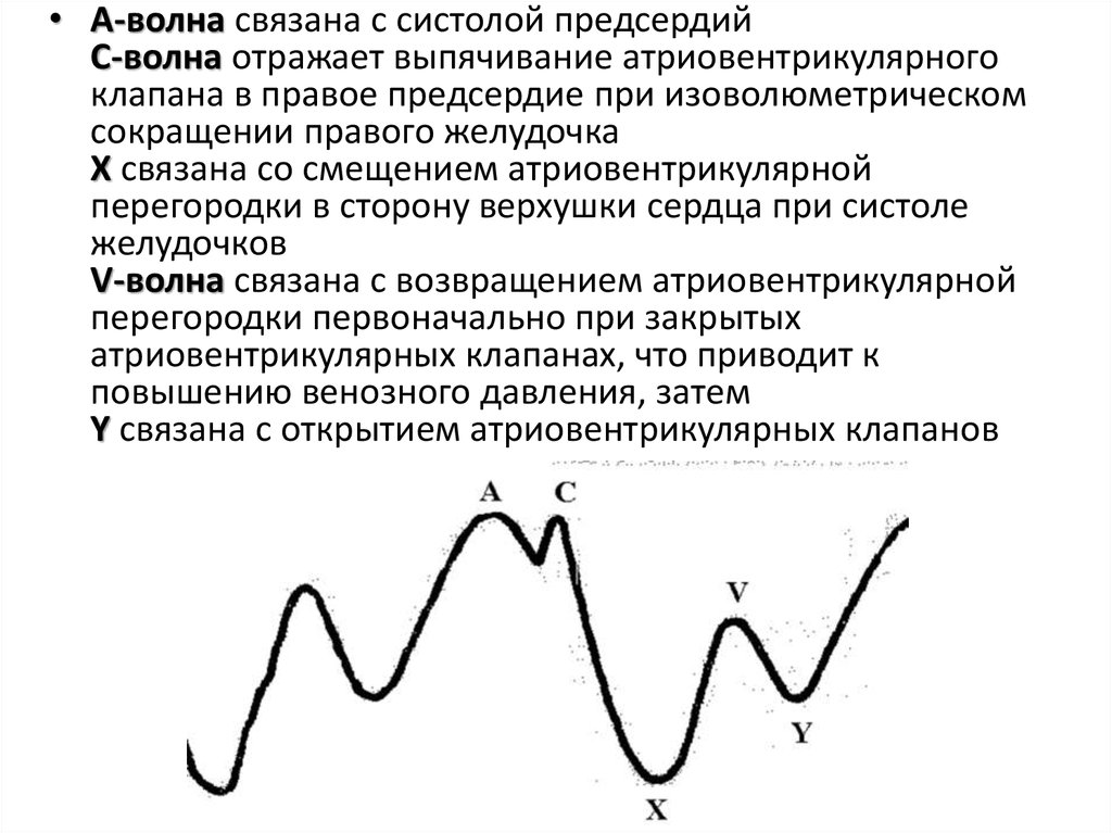 • А-волна связана с систолой предсердийС-волна отражает выпячивание атриовентрикулярного