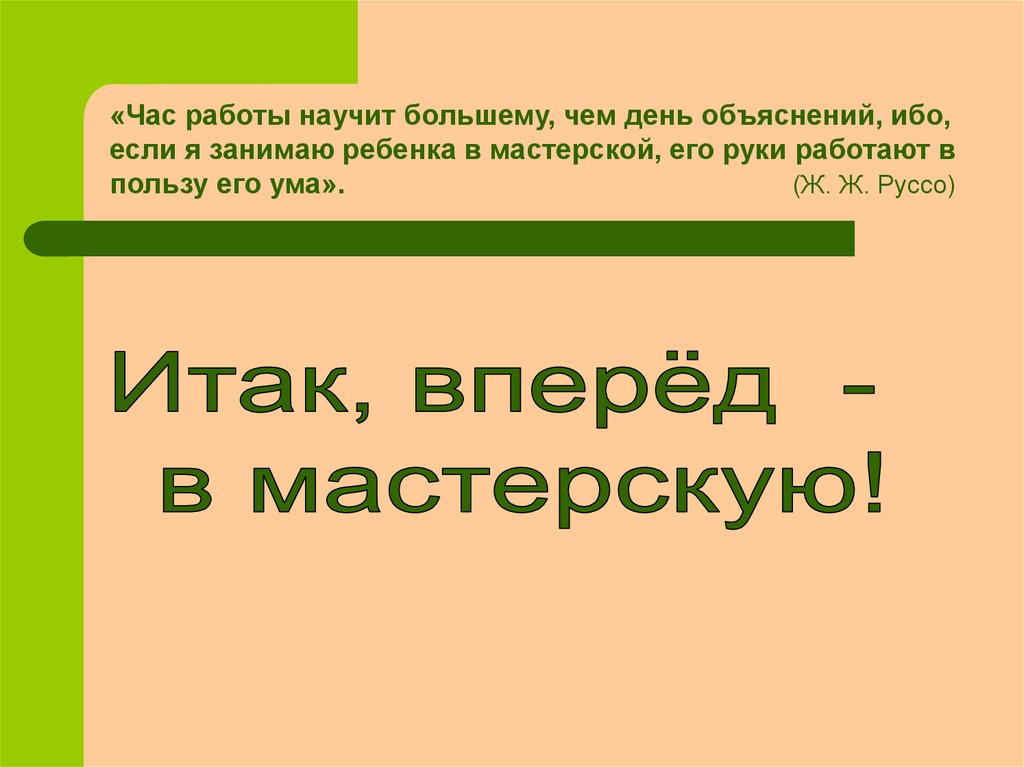 «Час работы научит большему, чем день объяснений, ибо,если я занимаю ребенка в мастерской, его руки работают в