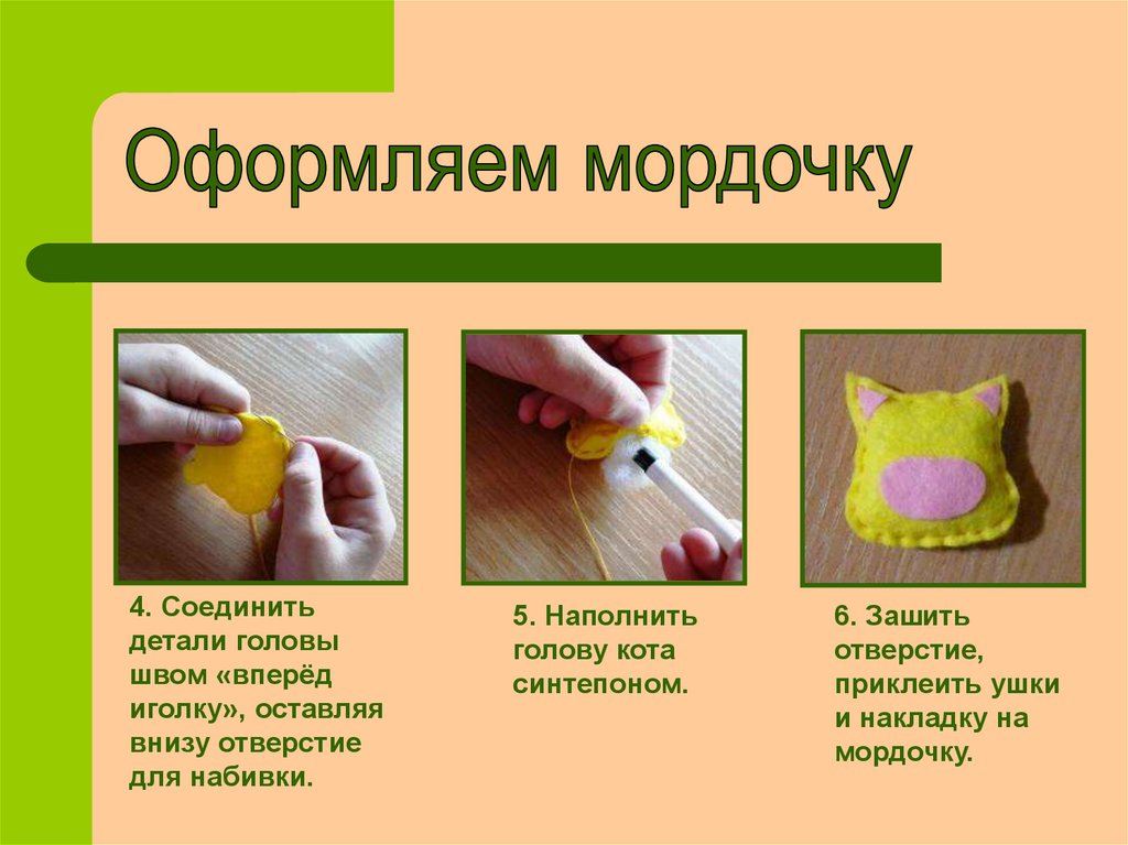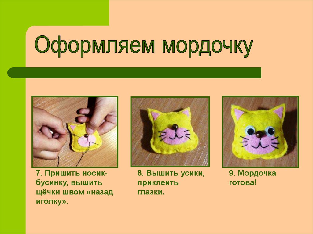 7. Пришить носикбусинку, вышитьщёчки швом «назад