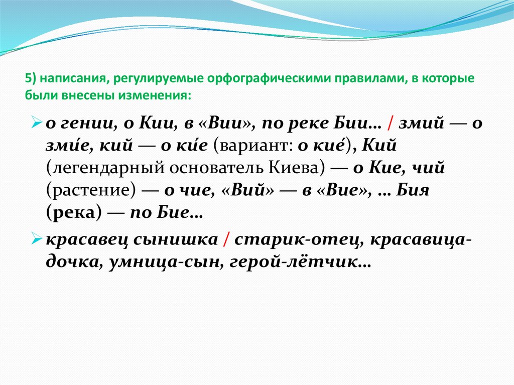 5) написания, регулируемые орфографическими правилами, в которыебыли внесены изменения: