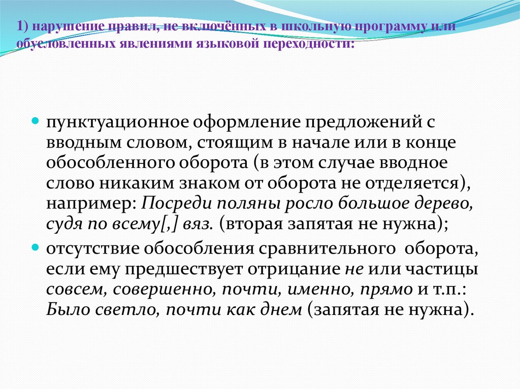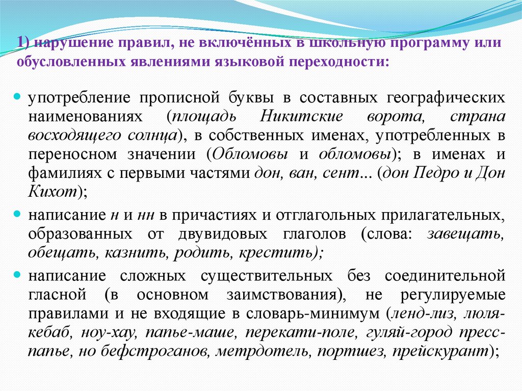 1) нарушение правил, не включённых в школьную программу илиобусловленных явлениями языковой переходности: