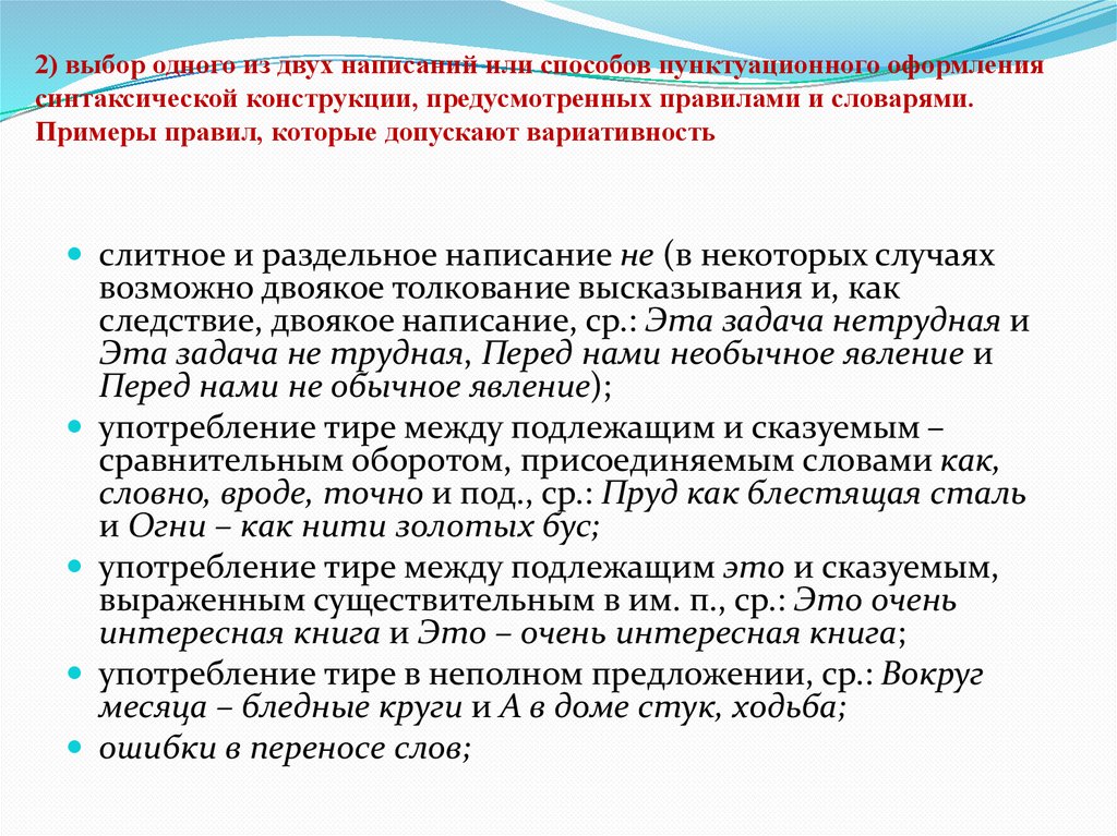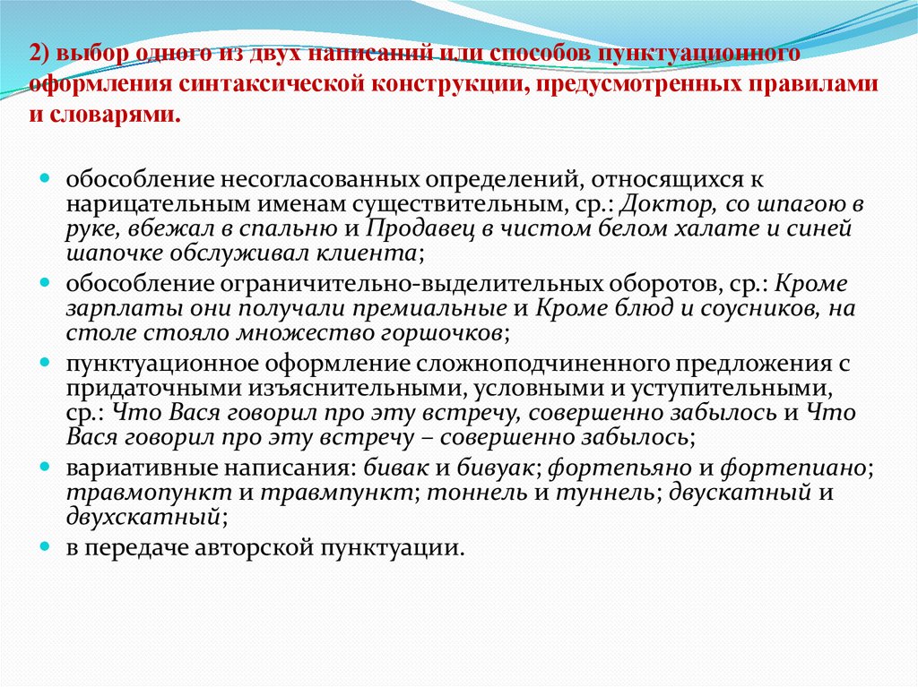 2) выбор одного из двух написаний или способов пунктуационногооформления синтаксической конструкции, предусмотренных правилами
