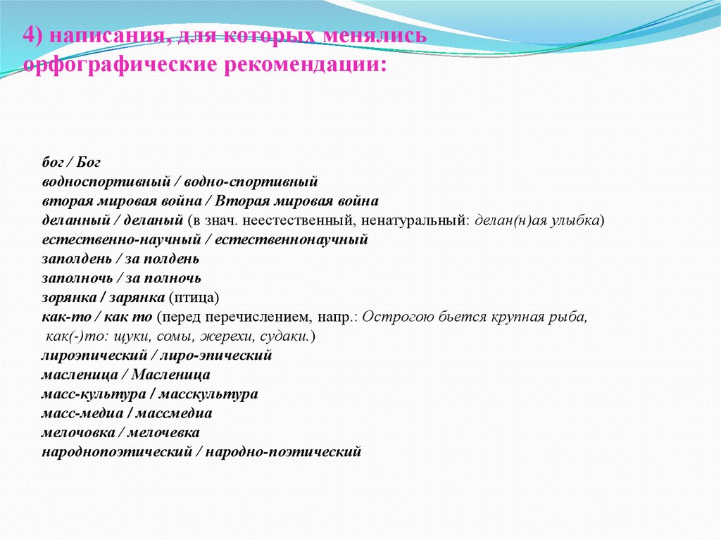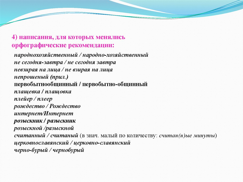 4) написания, для которых менялисьорфографические рекомендации: