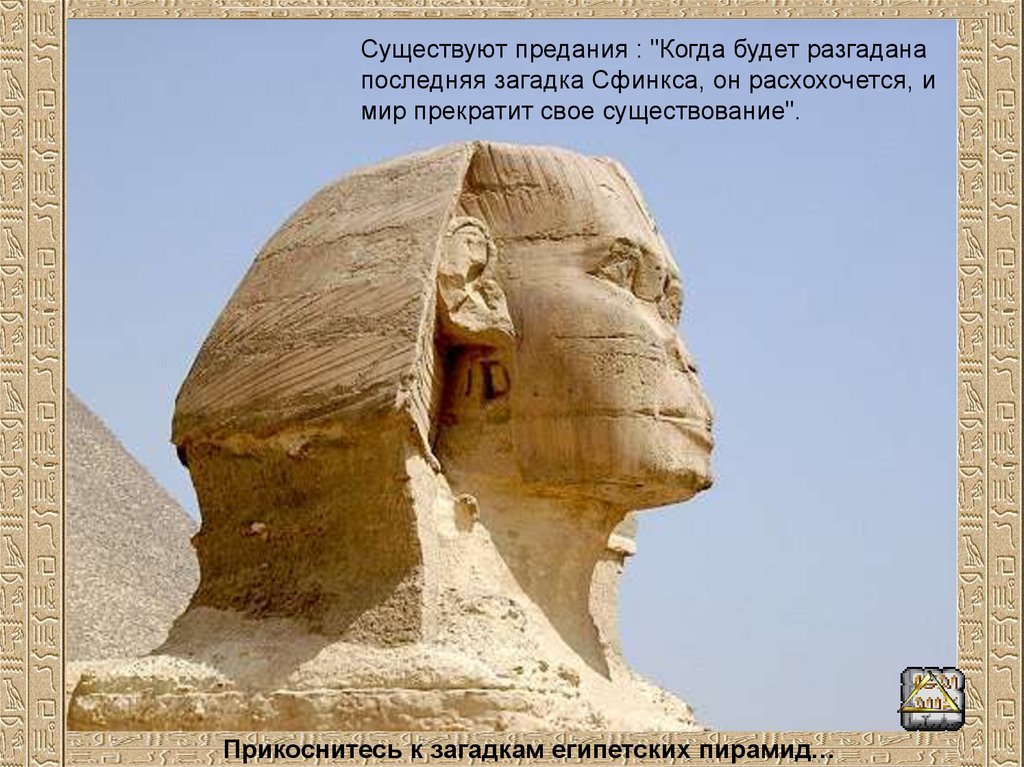 Существуют предания : "Когда будет разгаданапоследняя загадка Сфинкса, он расхохочется, и