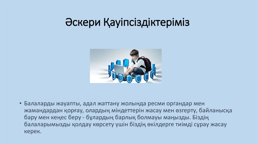Әскери Қауіпсіздіктеріміз• Балаларды жауапты, адал жаттану жолында ресми органдар мен