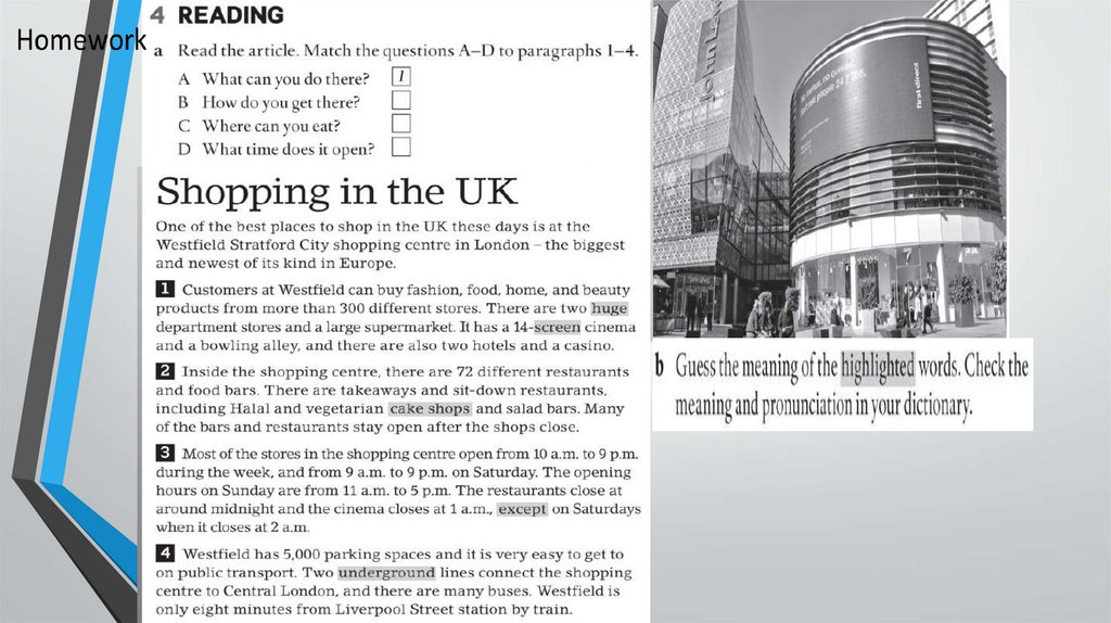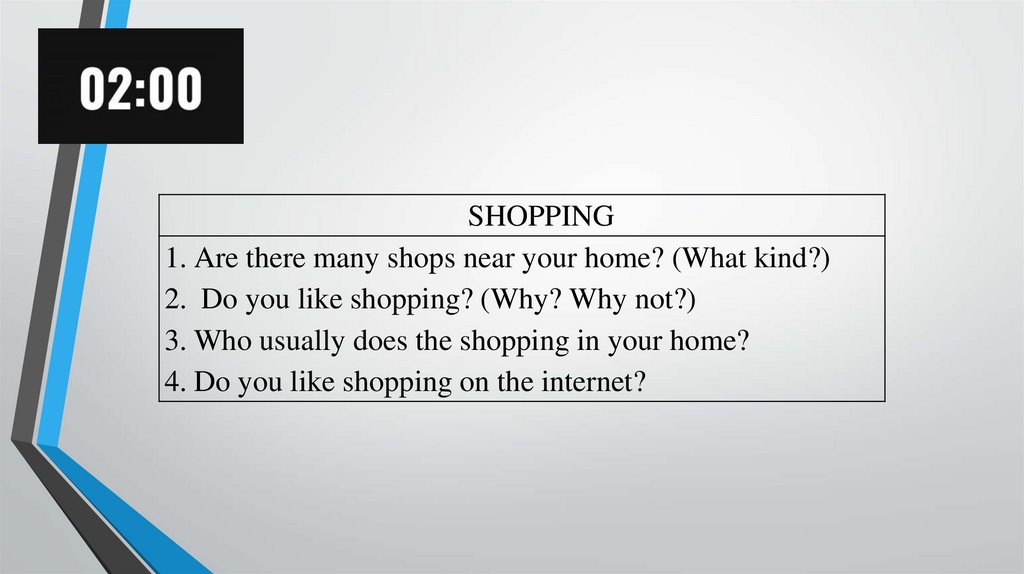 SHOPPING1. Are there many shops near your home? (What kind?)