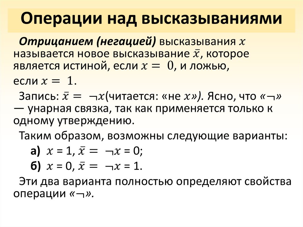 Операции над высказываниямиОтрицанием (негацией) высказывания