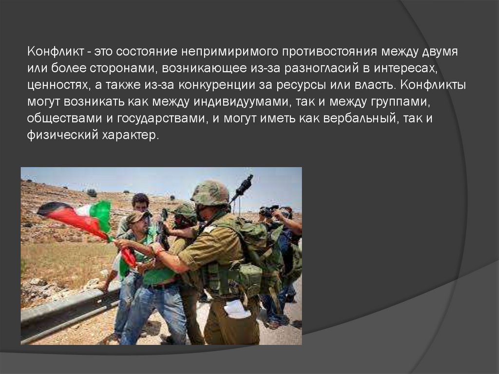 Конфликт - это состояние непримиримого противостояния между двумяили более сторонами, возникающее из-за разногласий в интересах,