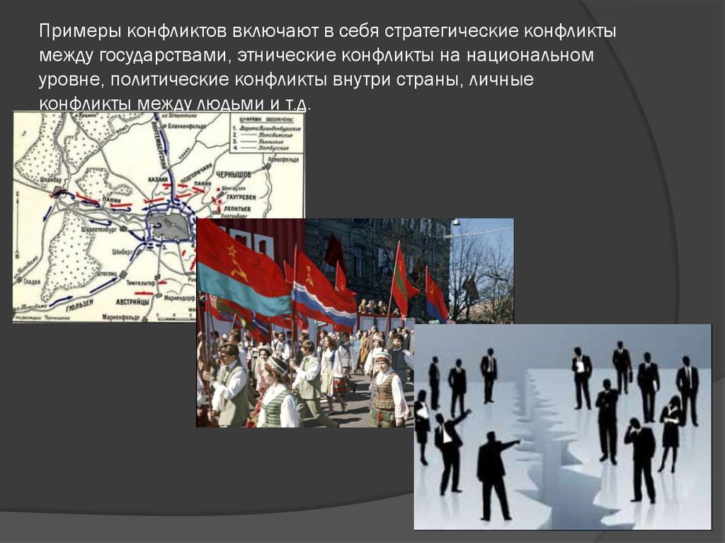Примеры конфликтов включают в себя стратегические конфликтымежду государствами, этнические конфликты на национальном