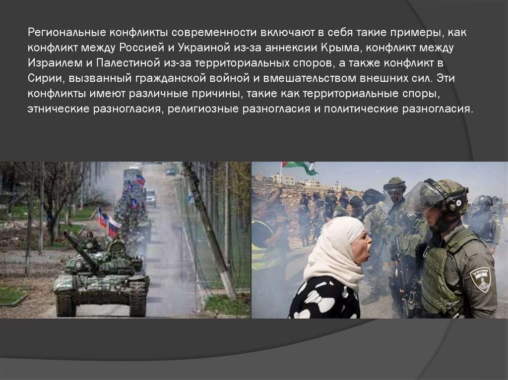 Региональные конфликты современности включают в себя такие примеры, какконфликт между Россией и Украиной из-за аннексии Крыма, конфликт между