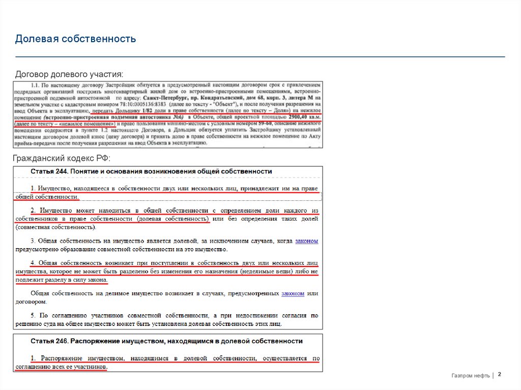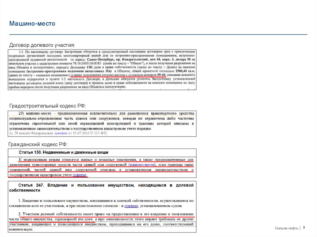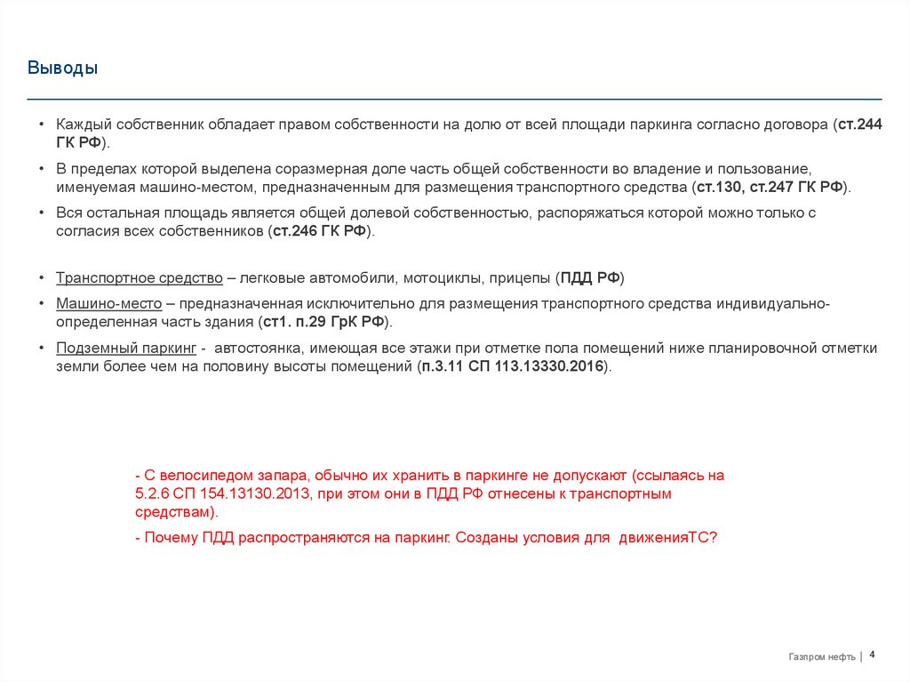 Выводы• Каждый собственник обладает правом собственности на долю от всей площади паркинга согласно договора (ст.244