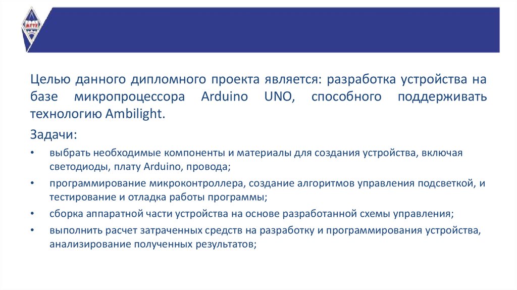 Целью данного дипломного проекта является: разработка устройства набазе микропроцессора Arduino UNO, способного поддерживать