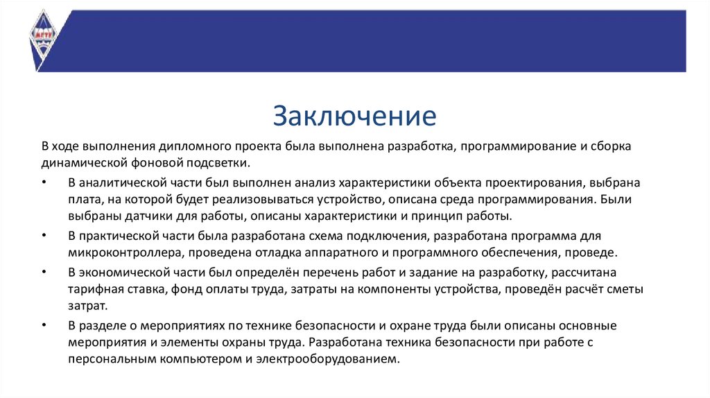 ЗаключениеВ ходе выполнения дипломного проекта была выполнена разработка, программирование и сборка