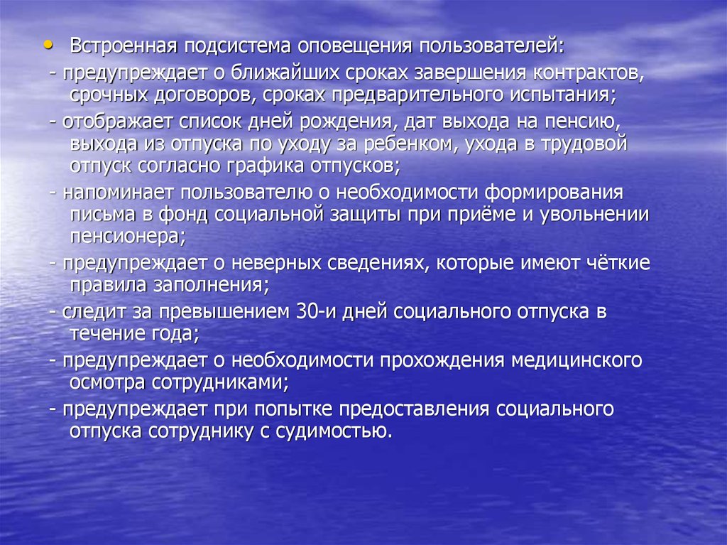 • Встроенная подсистема оповещения пользователей:- предупреждает о ближайших сроках завершения контрактов,