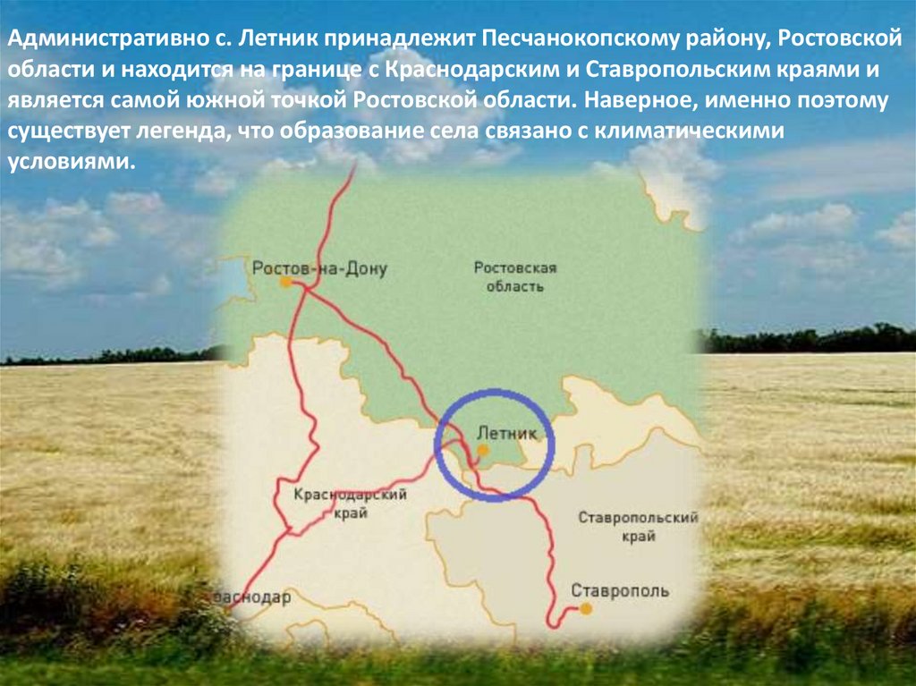 Административно с. Летник принадлежит Песчанокопскому району, Ростовскойобласти и находится на границе с Краснодарским и Ставропольским краями и