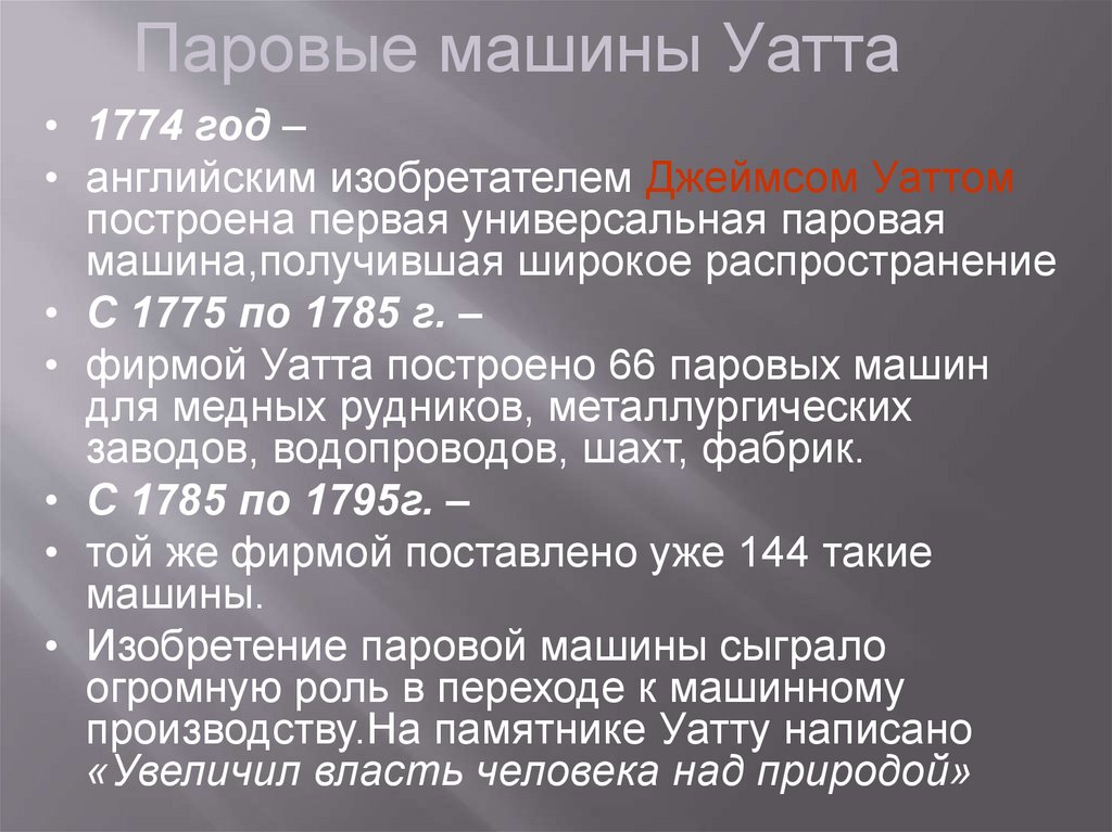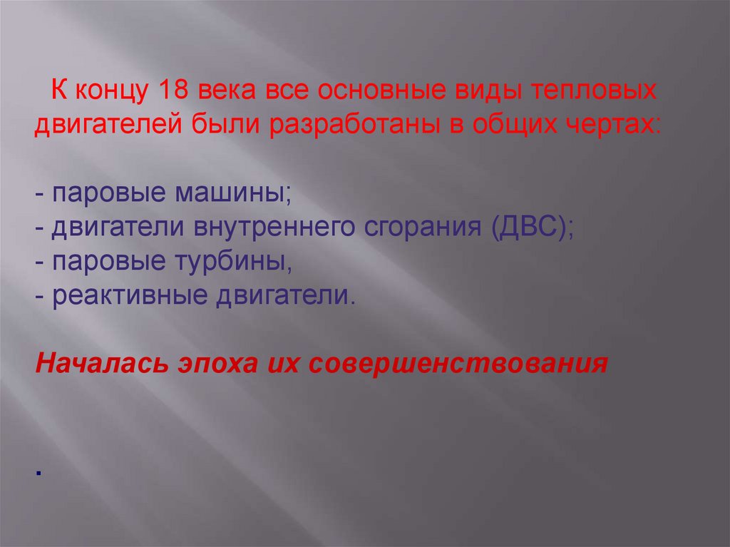К концу 18 века все основные виды тепловыхдвигателей были разработаны в общих чертах: