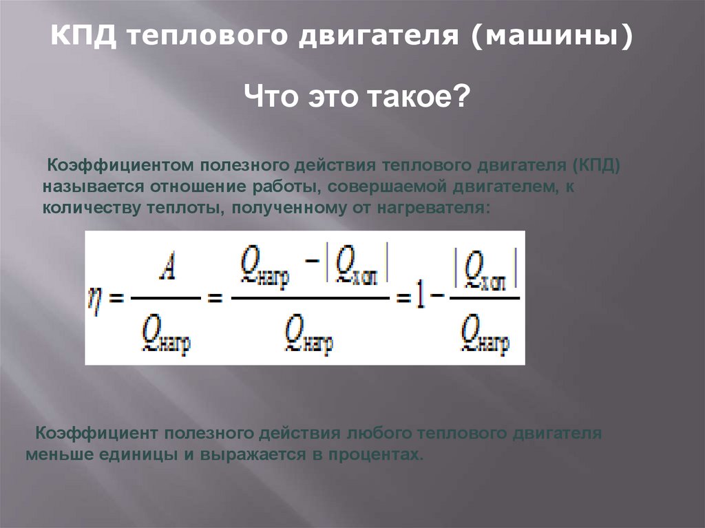 Коэффициентом полезного действия теплового двигателя (КПД)