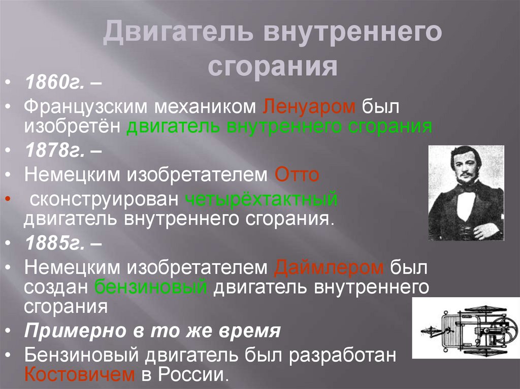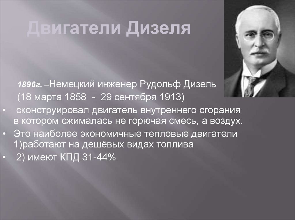 Двигатели Дизеля1896г. –Немецкий инженер Рудольф Дизель