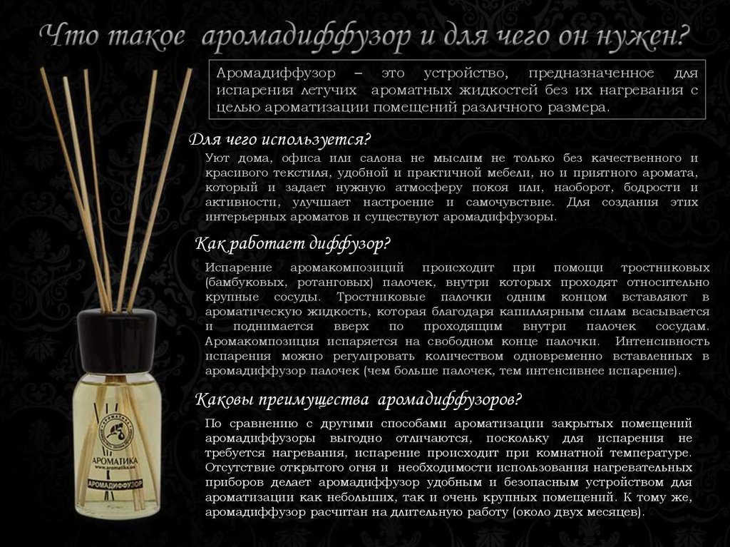 Аромадиффузор – это устройство, предназначенное дляиспарения летучих ароматных жидкостей без их нагревания с