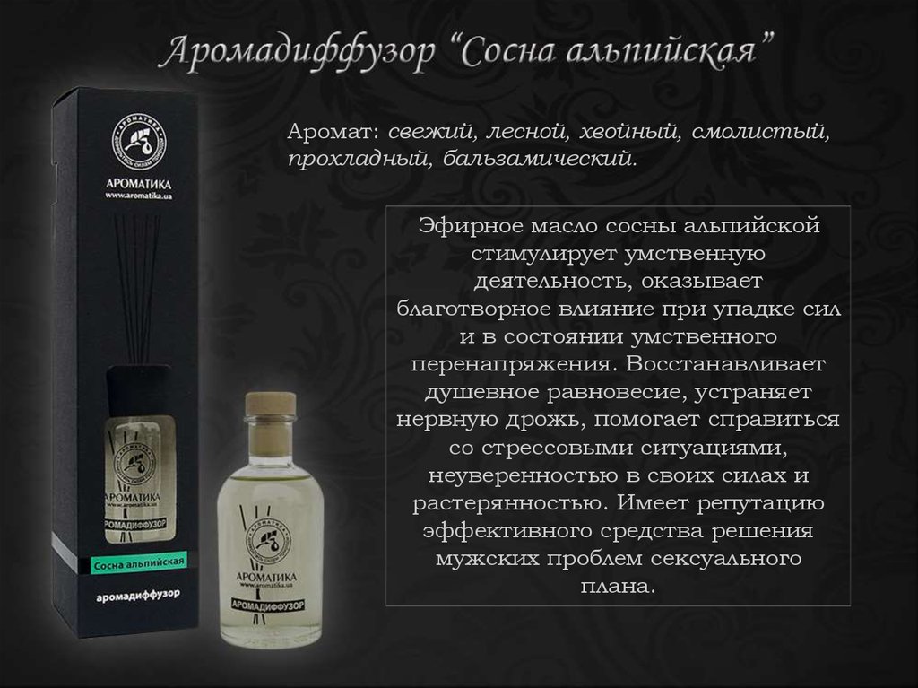 Аромат: свежий, лесной, хвойный, смолистый,прохладный, бальзамический.