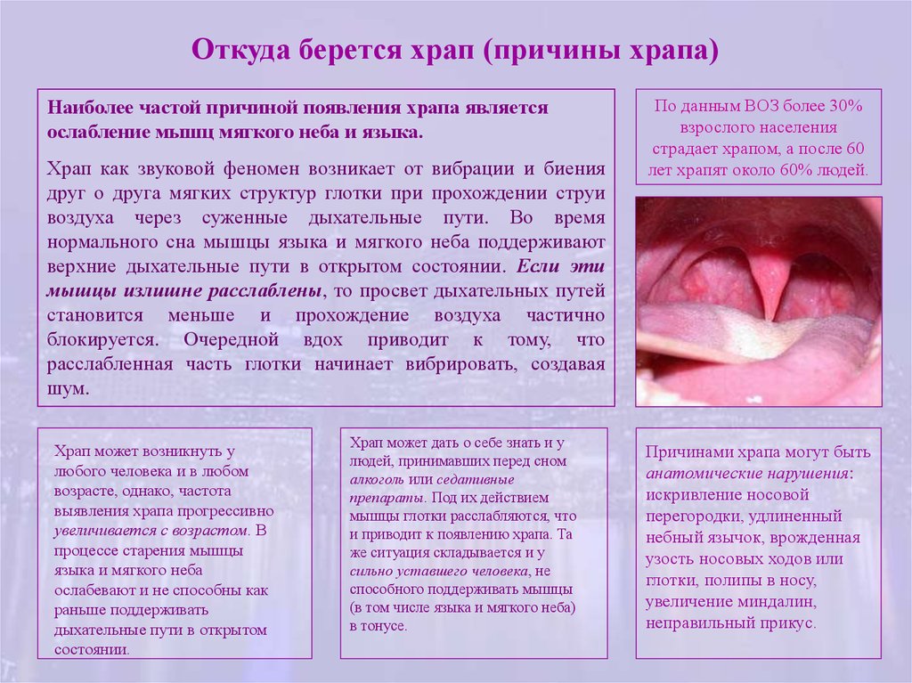 Откуда берется храп (причины храпа)Наиболее частой причиной появления храпа является