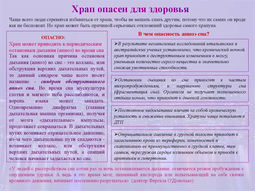 Храп опасен для здоровьяЧаще всего люди стремятся избавиться от храпа, чтобы не мешать спать другим, потому что их самих он вроде