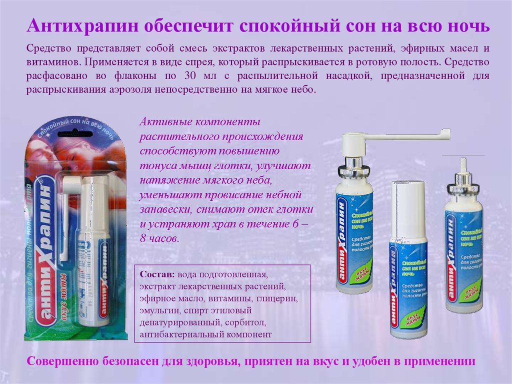 Антихрапин обеспечит спокойный сон на всю ночьСредство представляет собой смесь экстрактов лекарственных растений, эфирных масел и