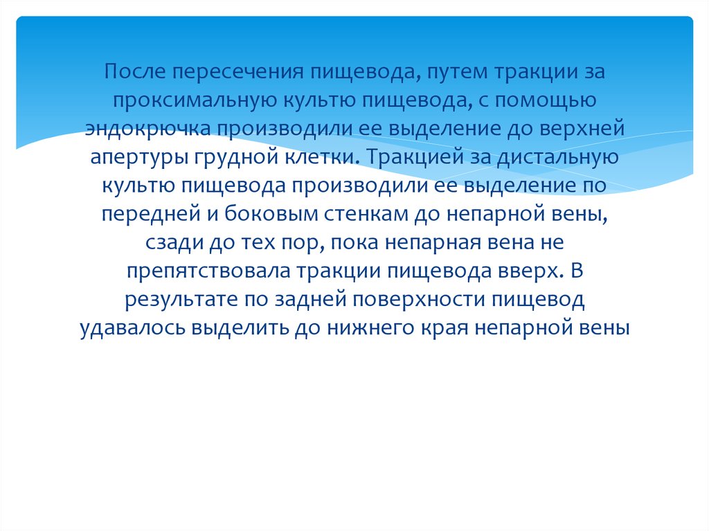 После пересечения пищевода, путем тракции запроксимальную культю пищевода, с помощью
