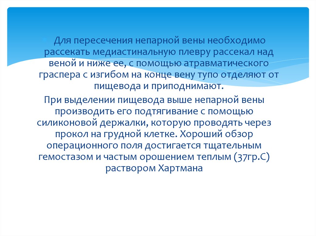 Для пересечения непарной вены необходиморассекать медиастинальную плевру рассекал над
