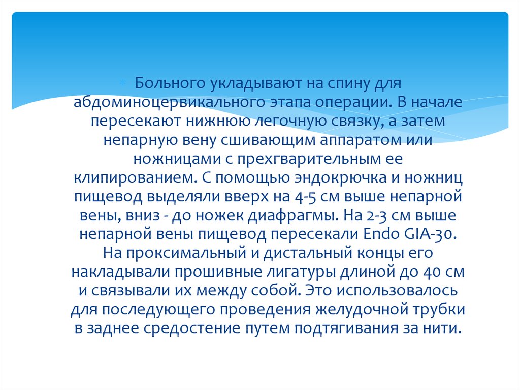 Больного укладывают на спину дляабдоминоцервикального этапа операции. В начале
