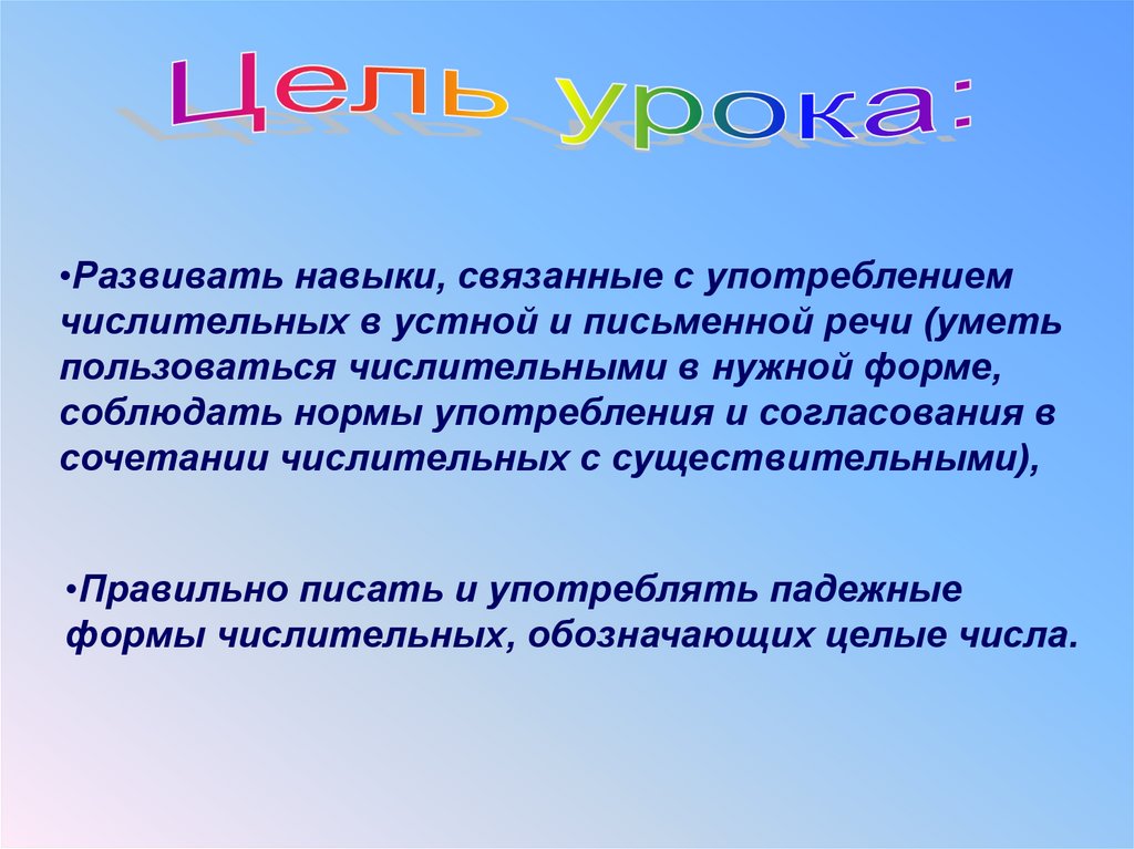 •Развивать навыки, связанные с употреблениемчислительных в устной и письменной речи (уметь