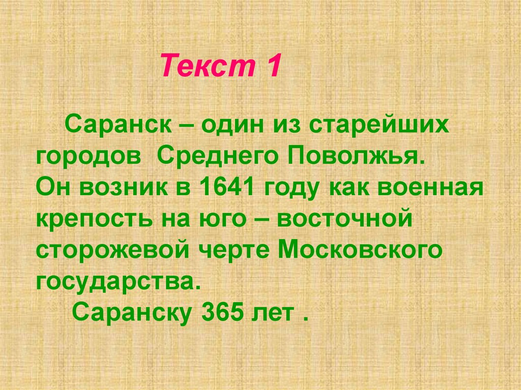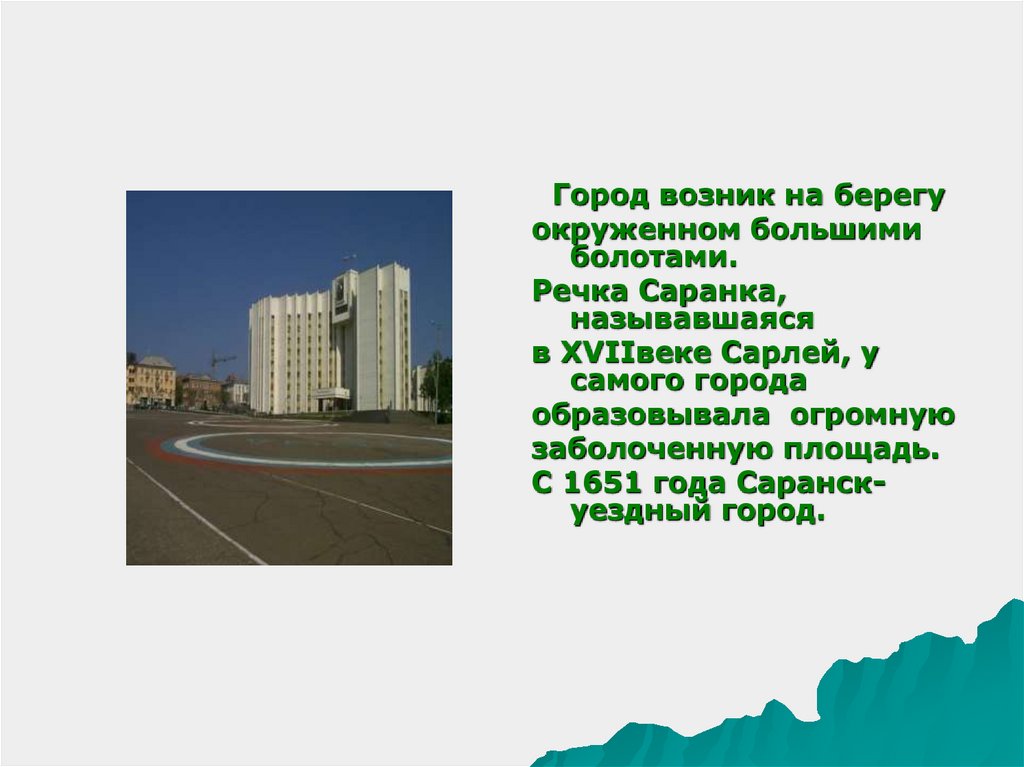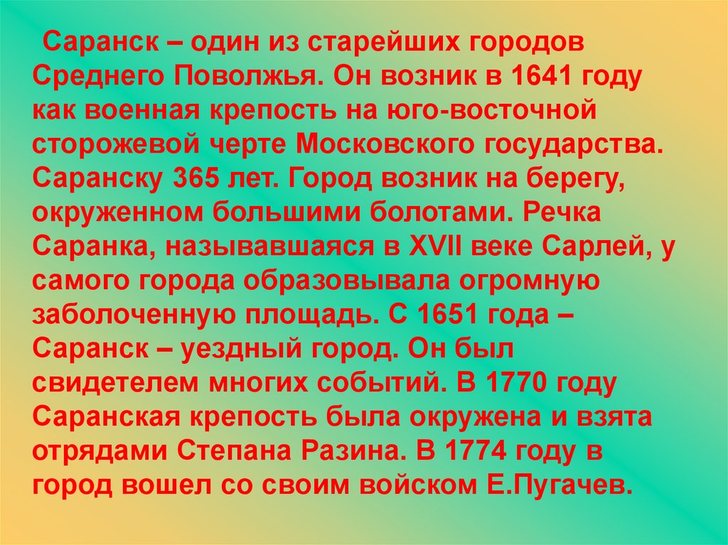 Саранск – один из старейших городовСреднего Поволжья. Он возник в 1641 году