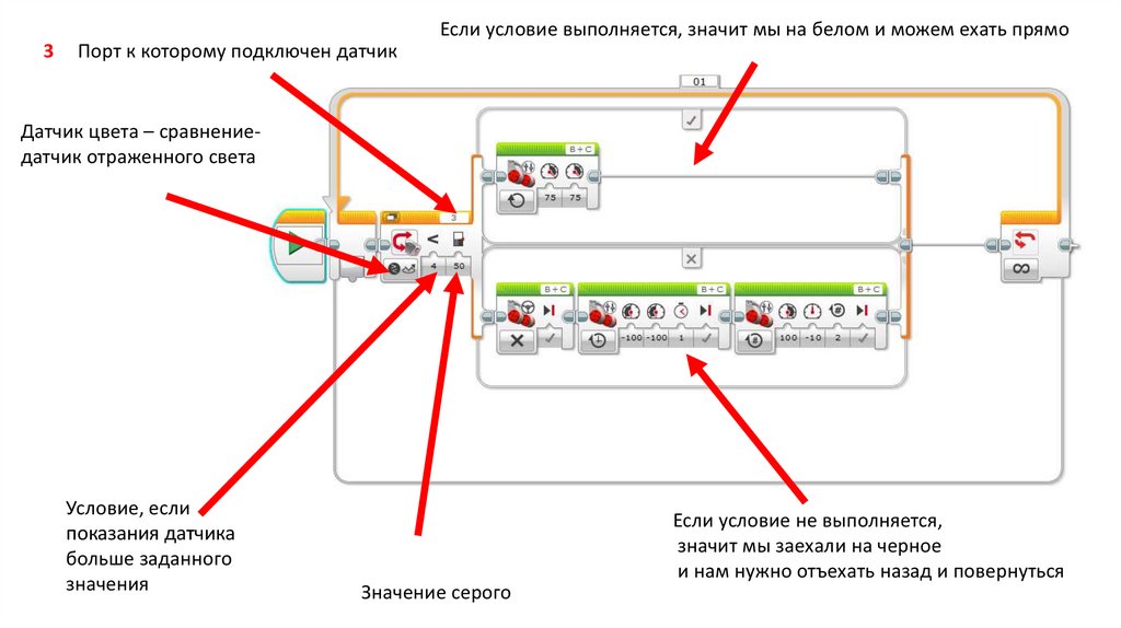 Если условие выполняется, значит мы на белом и можем ехать прямо3