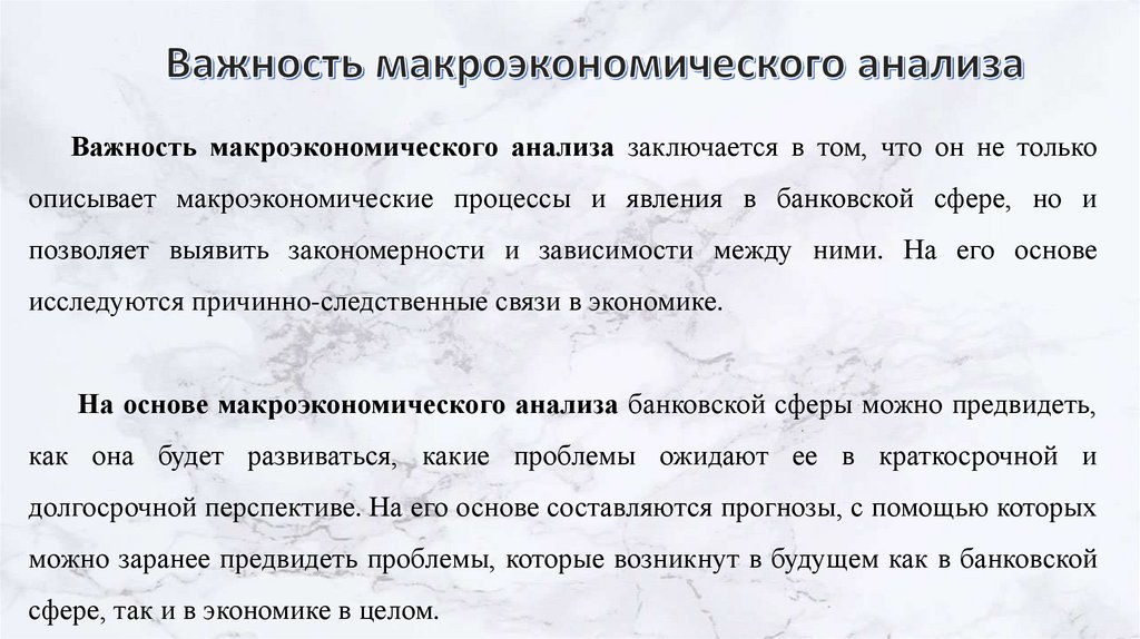 Важность макроэкономического анализа заключается в том, что он не толькоописывает макроэкономические процессы и явления в банковской сфере, но и