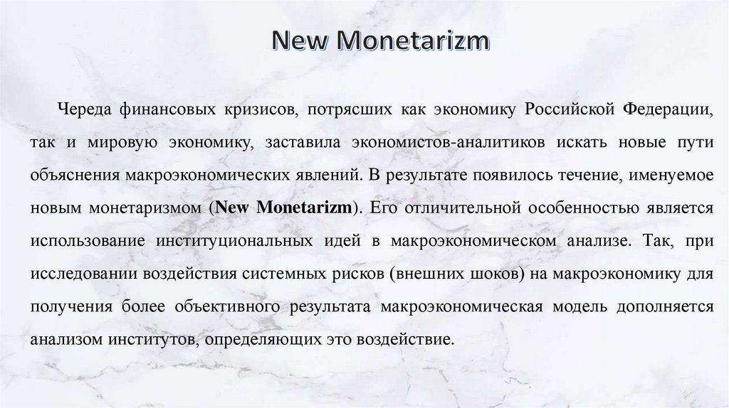новым монетаризмом (New Monetarizm). Его отличительной особенностью является