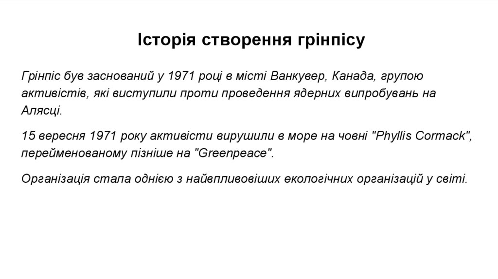 Історія створення грінпісуГрінпіс був заснований у 1971 році в місті Ванкувер, Канада, групою