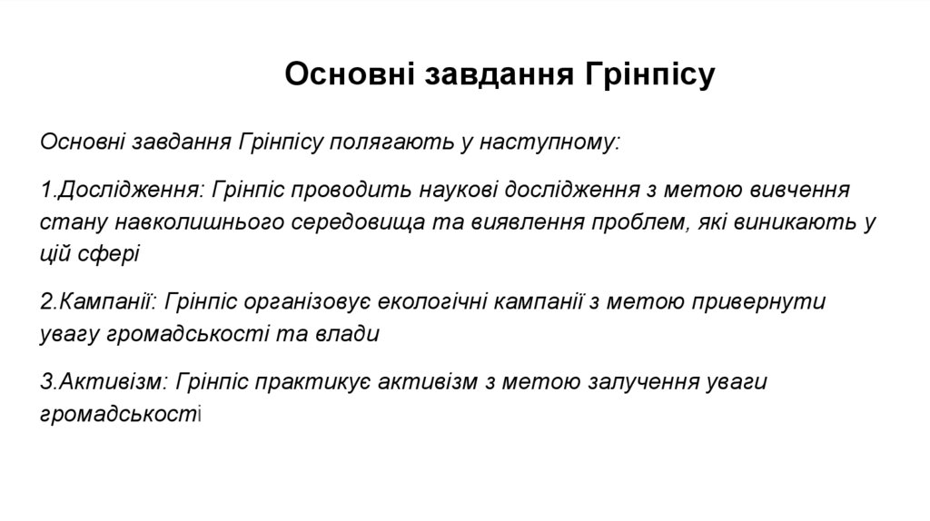 Основні завдання ГрінпісуОсновні завдання Грінпісу полягають у наступному: