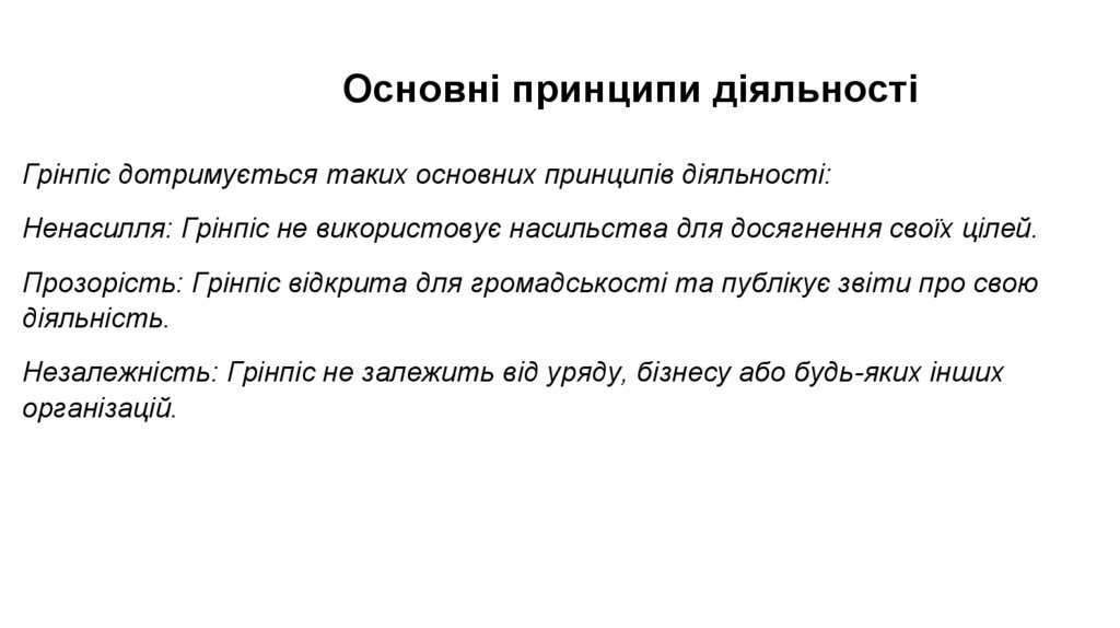 Основні принципи діяльностіГрінпіс дотримується таких основних принципів діяльності: