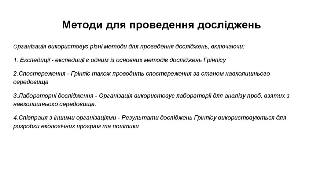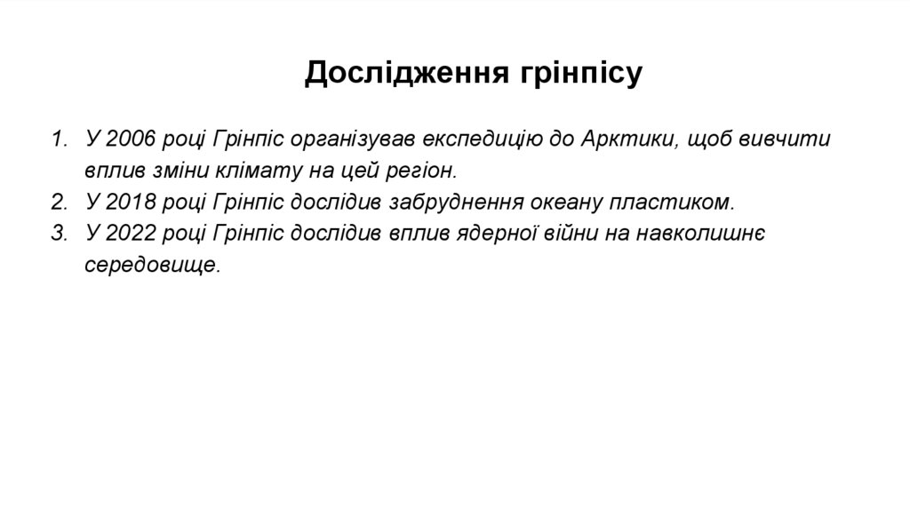 1.Дослідження: Грінпіс проводить наукові дослідження з метою вивчення