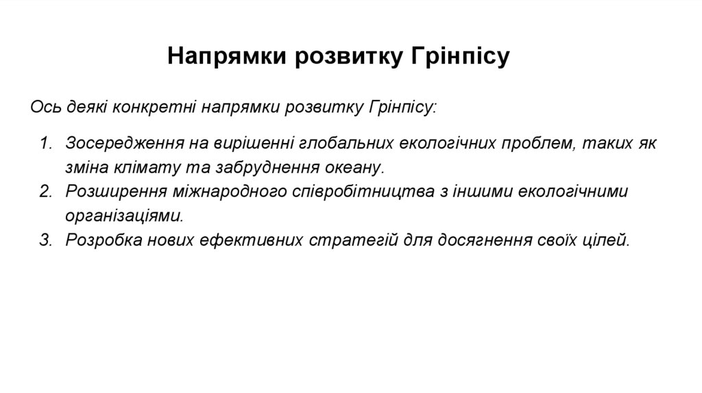 Напрямки розвитку ГрінпісуОсь деякі конкретні напрямки розвитку Грінпісу: