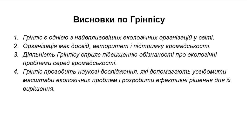 Висновки по Грінпісу1. Грінпіс є однією з найвпливовіших екологічних організацій у світі.