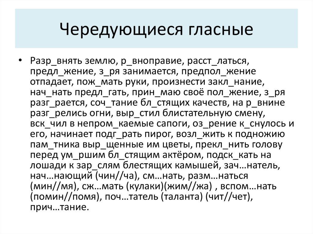 Чередующиеся гласные• Разр_внять землю, р_вноправие, расст_латься,