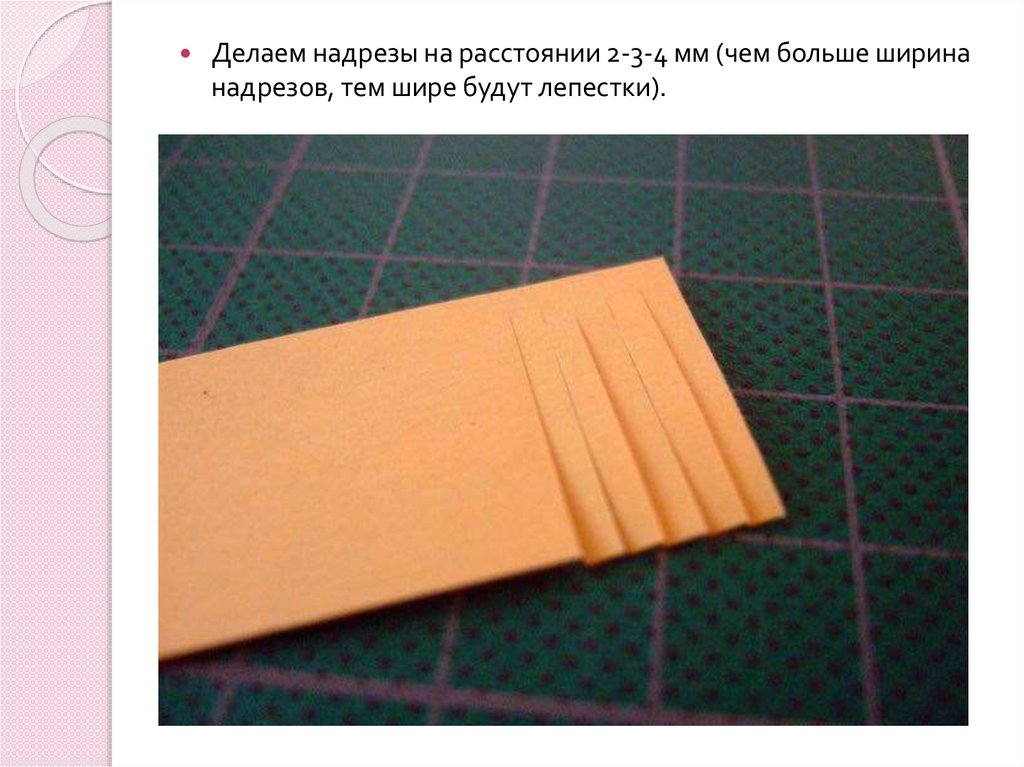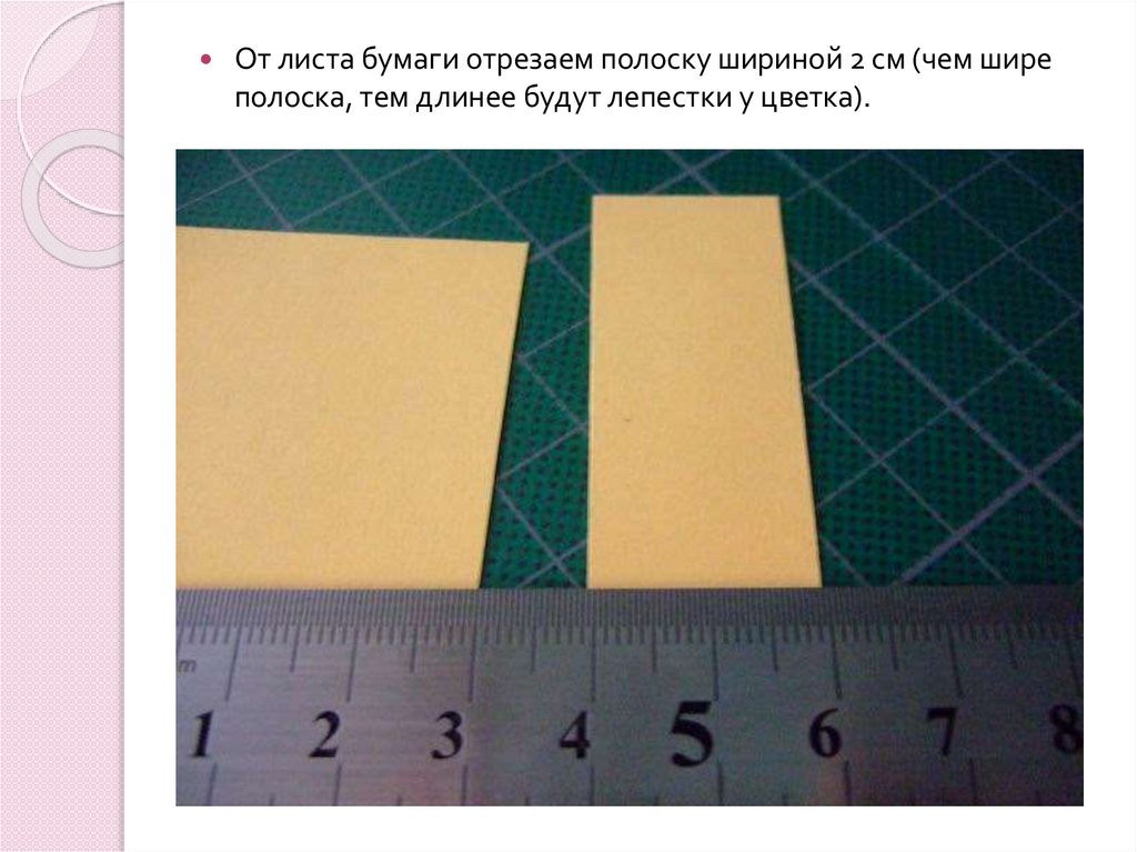 От листа бумаги отрезаем полоску шириной 2 см (чем ширеполоска, тем длинее будут лепестки у цветка).