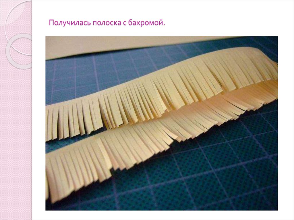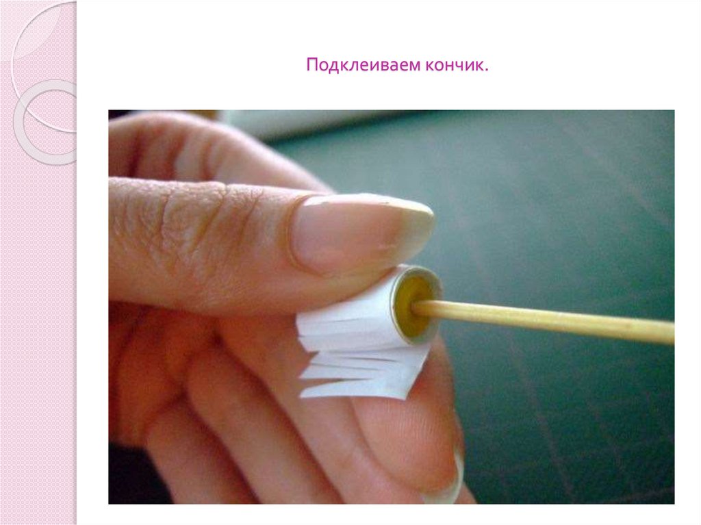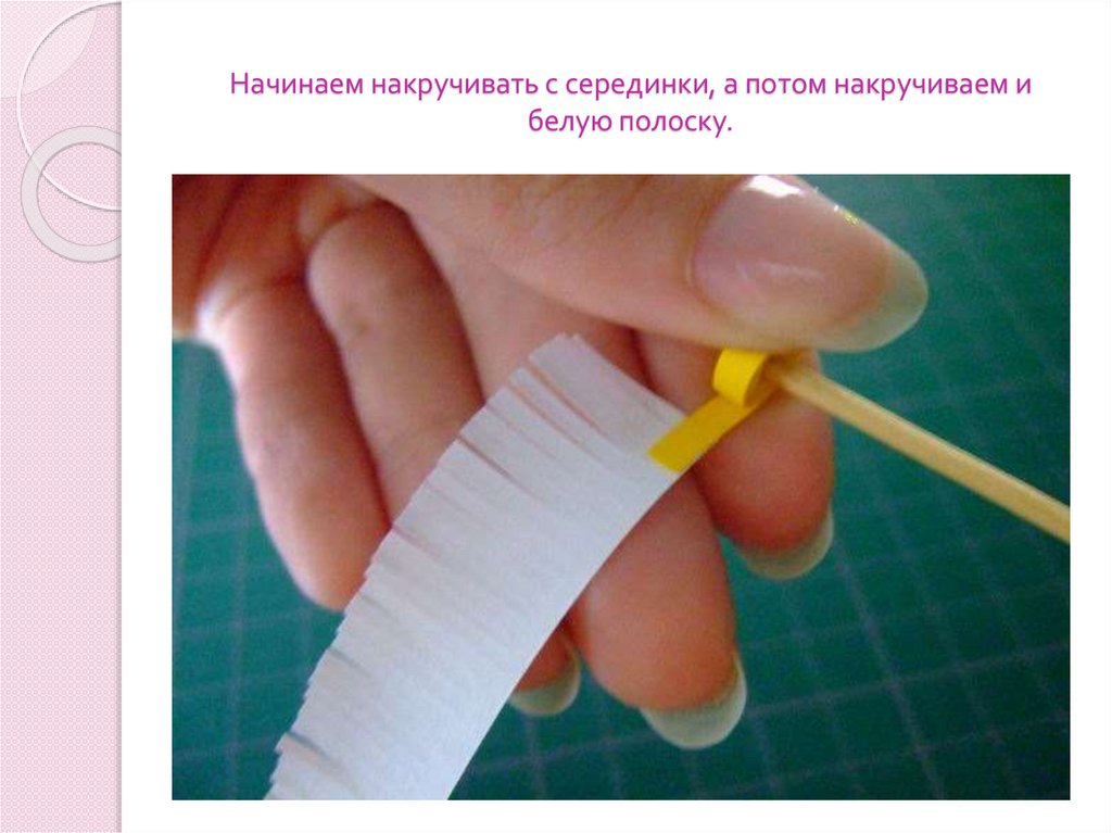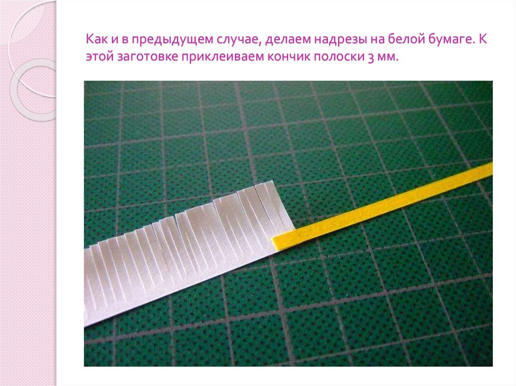 Как и в предыдущем случае, делаем надрезы на белой бумаге. Кэтой заготовке приклеиваем кончик полоски 3 мм.