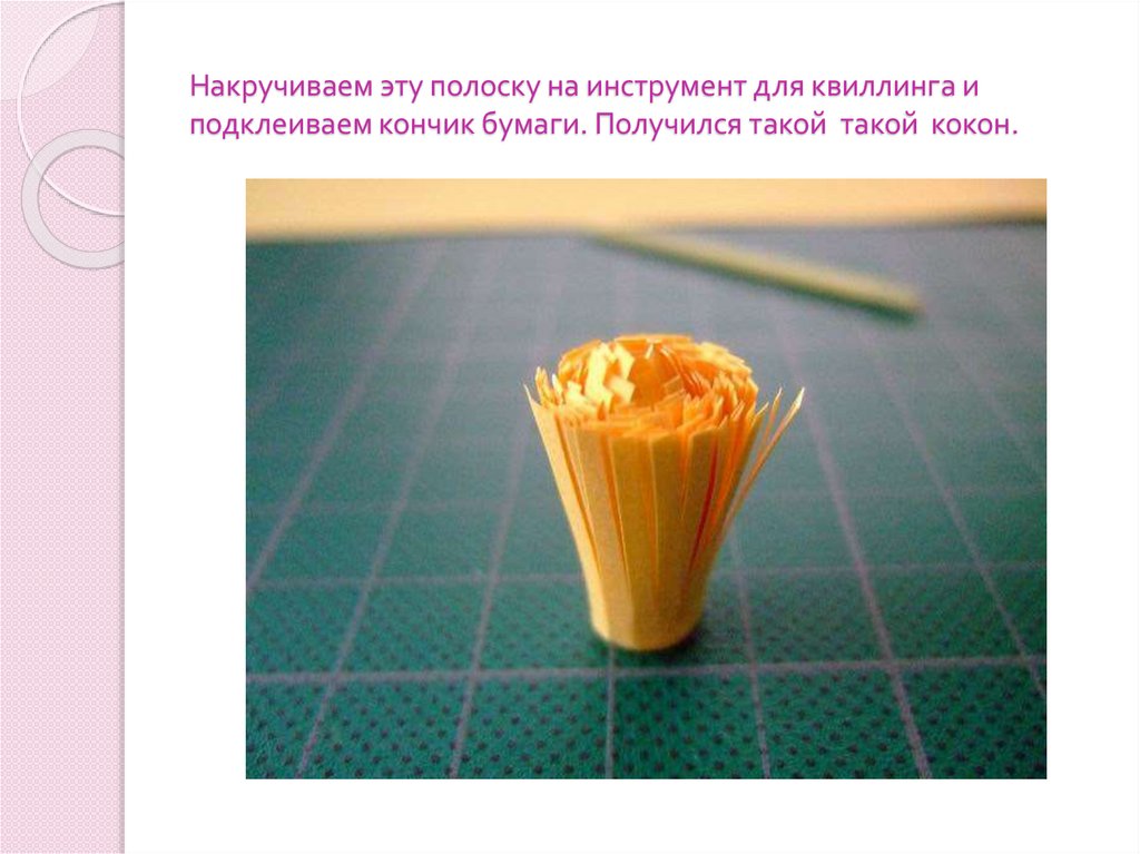 Накручиваем эту полоску на инструмент для квиллинга иподклеиваем кончик бумаги. Получился такой такой кокон.