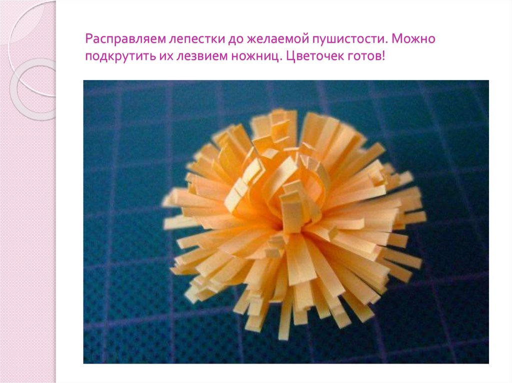 Расправляем лепестки до желаемой пушистости. Можноподкрутить их лезвием ножниц. Цветочек готов!