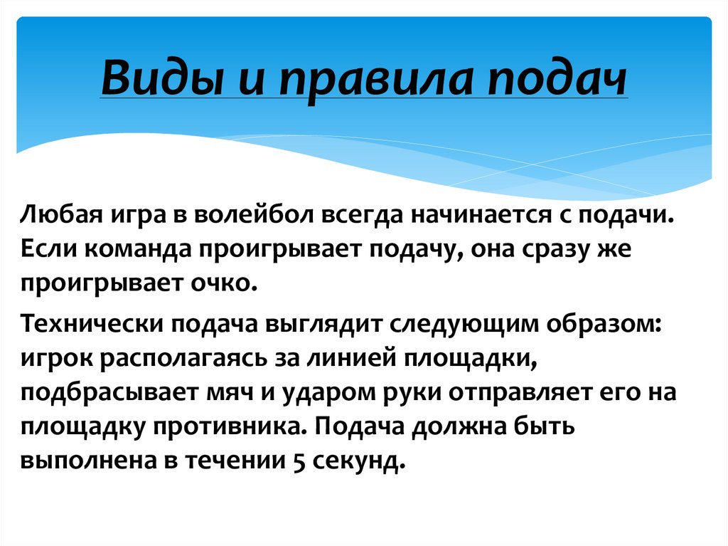 Виды и правила подачЛюбая игра в волейбол всегда начинается с подачи.