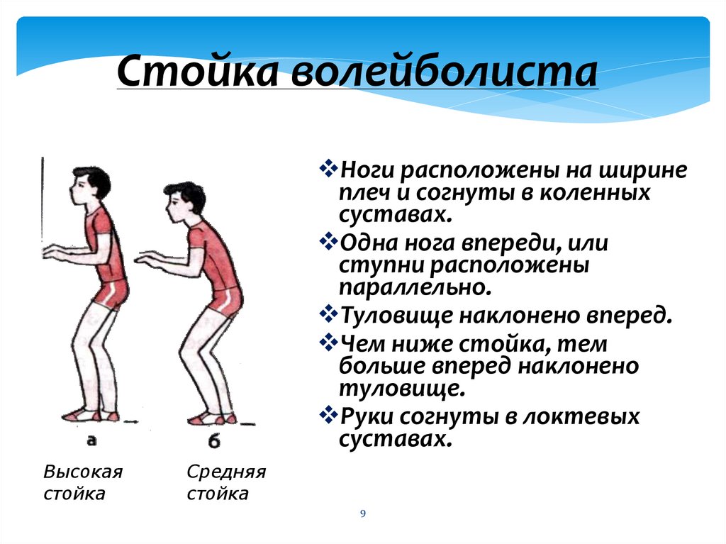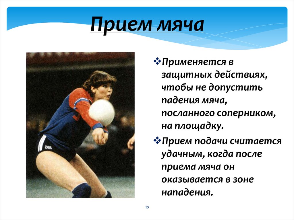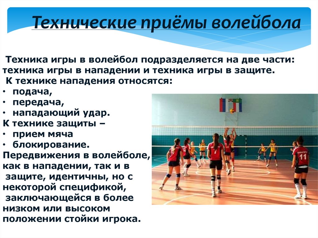 Технические приёмы волейболаТехника игры в волейбол подразделяется на две части: