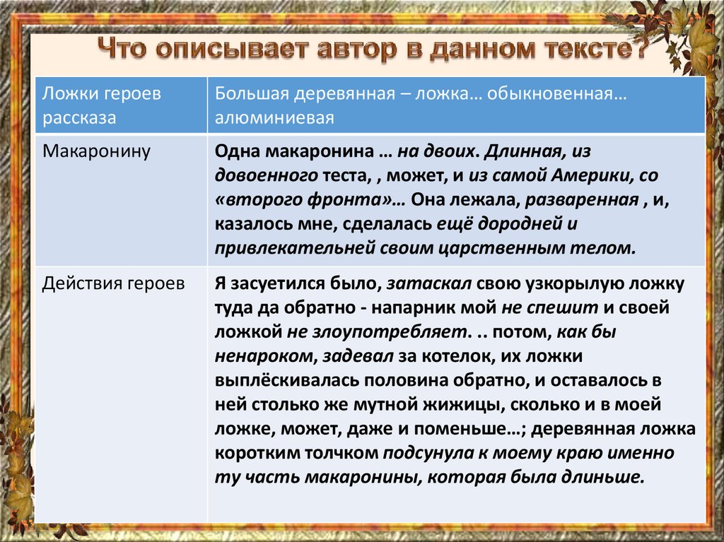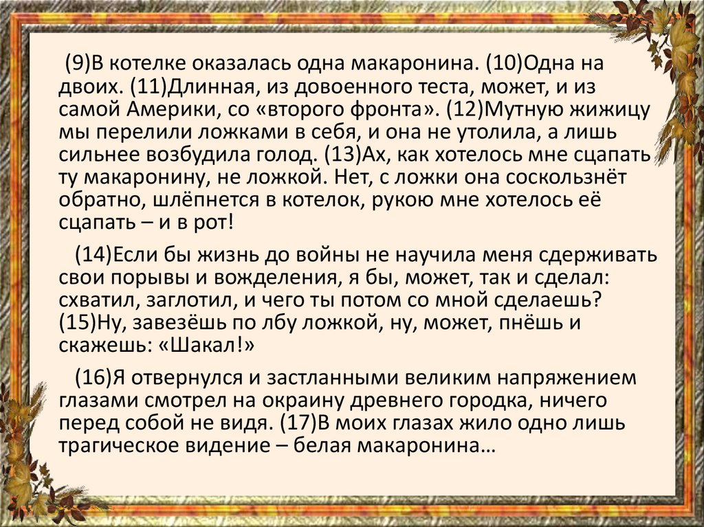 (9)В котелке оказалась одна макаронина. (10)Одна надвоих. (11)Длинная, из довоенного теста, может, и из